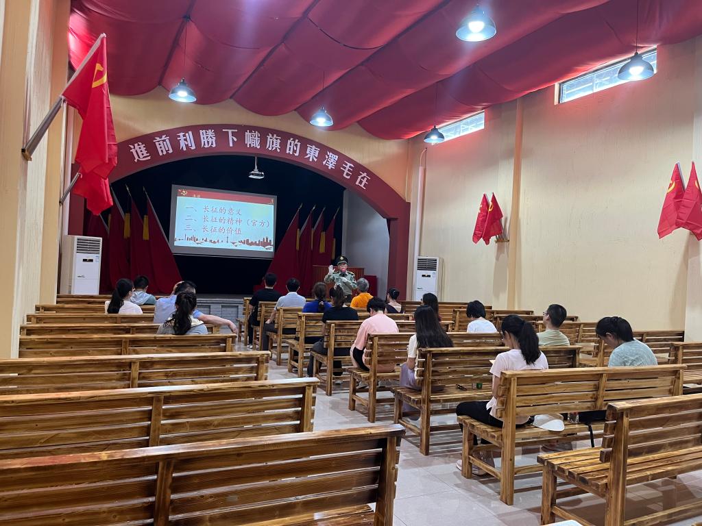 通过听、看、学、动、感、悟等形式,“沉浸式”体验长征精神。在鲜红党旗的指引下,党员教师沿着红二十五军的足迹,用脚步丈量历史,沿途听讲解、诵经典、看图文、唱红歌,经过将军路,了解“百将之师”的英雄人物,聆听血战独树镇、鏖战庾家河两场战斗经过……一路上,党员们体验到红军长征路上的艰难险阻,进一步感悟共产党人的初心与使命担当,汲取前行的信仰力量。由有着45年党龄的陈列馆馆长萧本初同志为大家讲述了以“长征精神”为主题的党课,诠释了长征精神的内涵,让大家进一步感悟长征精神。