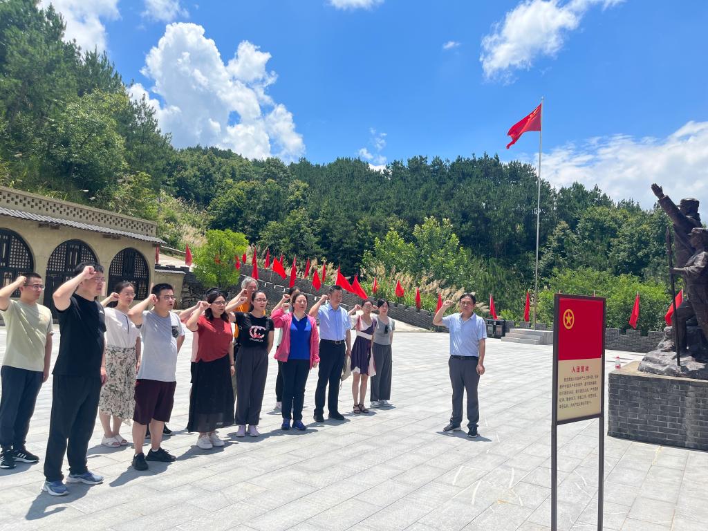 在大别山革命历史文化陈列馆前,公司党委书记郑全新带领大家重温入党誓词。面对鲜红的党旗,全体党员整齐列队,庄严地高举右手,重温入党誓词,一字一句铿锵有力,拳拳之心永向党。