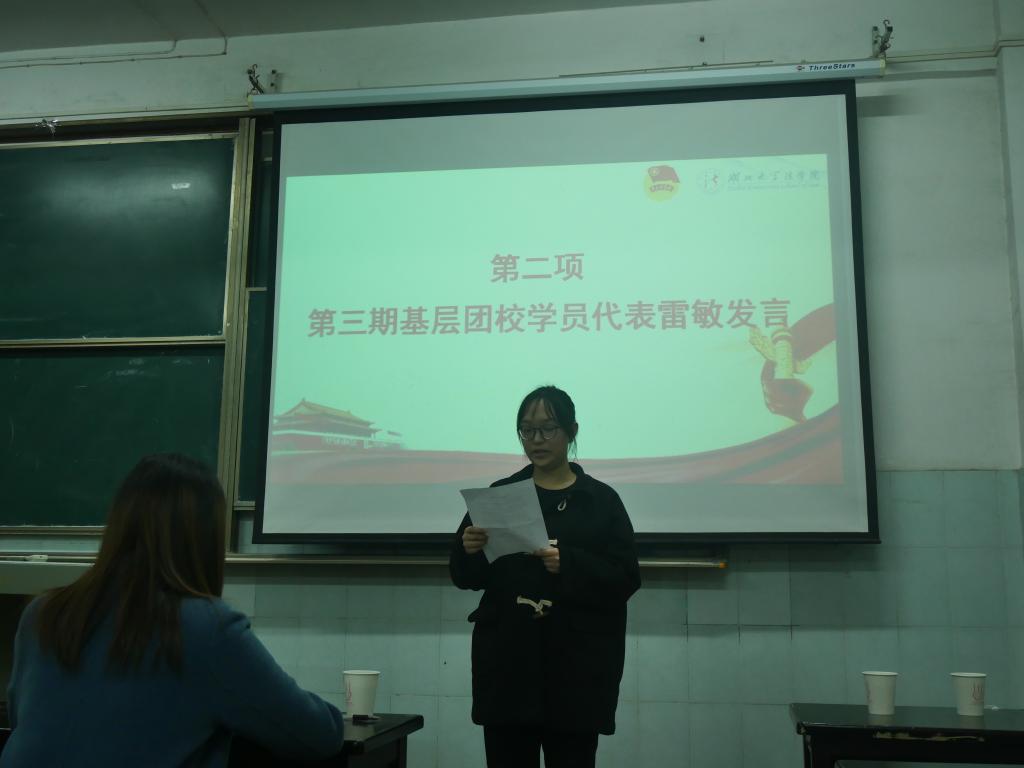开班仪式第一项,全体成员起立一同奏唱中国共产主义青年团团歌《光荣啊,中国共青团》。接下来,第三期基层团校学员代表雷敏同学发言,倡导每位青年都将“系党团、驭时事、绽青春”的信念牢记心中,并融会贯通、身体力行。公司党委副书记张梦婵书记讲话,张书记给同学们提出了学习要求,指出了努力方向,希望青年们在“学理论”上下工夫,在“强信念”上下工夫,在“跟党走”上下工夫,每一位团校成员在课程期间勤于学习,勇于实践,善于创造,不负重托,充分发挥青年的先进带头作用,在以后的学习工作中都能不忘入团初心,牢记青春使命,在实现中华民族伟大复兴中国梦的新征程上奋勇前进。而后团校学员们以高昂的情绪和澎湃的热情,在学员代表蔡玉曦同学领誓下重温入团誓词。