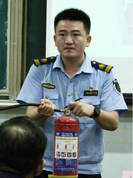 首先,蒋豪警官通过放映火灾发生时的真实案例视频,讲解单位发生火灾时的正确处置方法。并运用实物教老师们灭火器的正确使用方法。