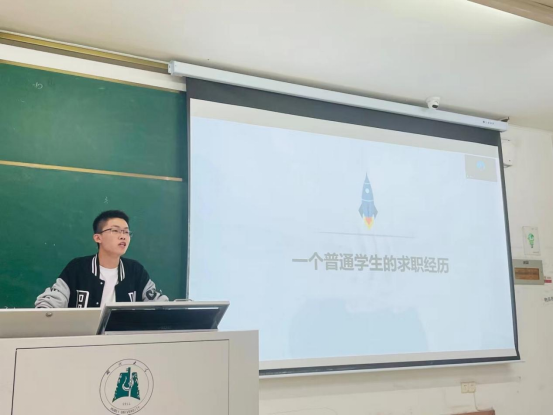罗廷永作题为“一个普通员工的求职经历”的经验分享。他分享了自己的整个心路历程,从备考考研到法考及秋招,再到考研结束、备考考公最后到就业、投递简历,并指出要重视秋招和简历制作。