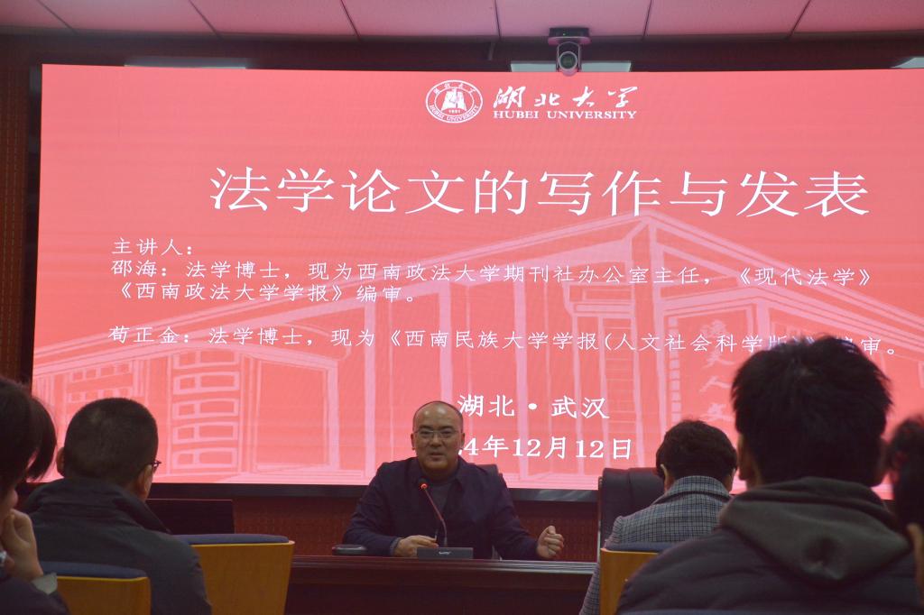2024年12月12日williamhill中文官网邀请《现代法学》《西南政法大学学报》编审邵海老师、《西南民族大学学报(人文社会科学版)》编审苟正金老师开展主题为《法学论文的写作与发表》的学术讲座,本次讲座由江岚老师主持,24级和23级法学研员工在williamhill中文官网报告厅参加,参加活动的同学针对相关话题进行了交流与探讨。