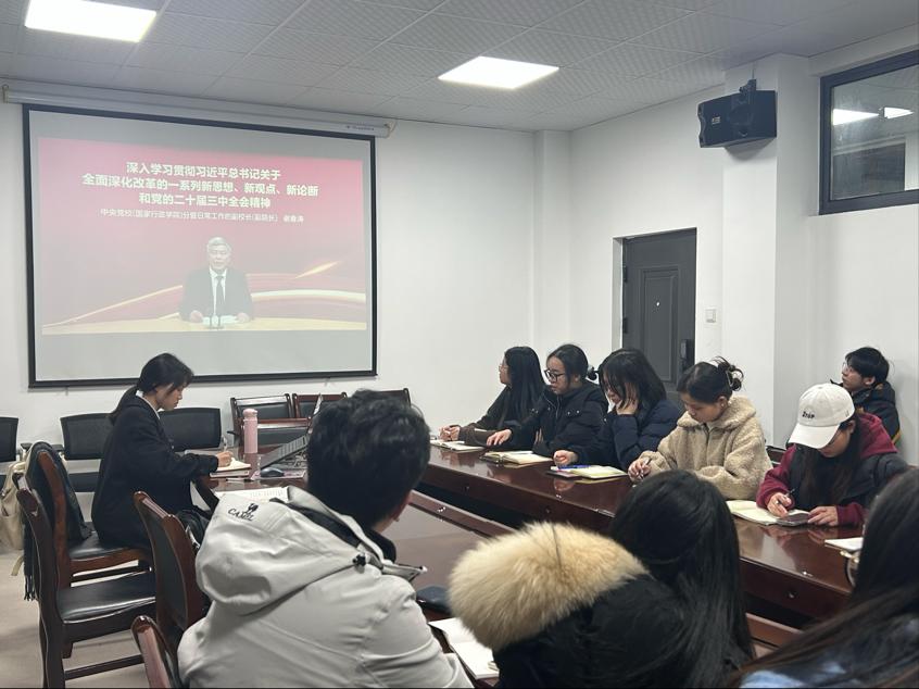 williamhill中文官网本科生第一党支部于2024年11月28日在williamhill中文官网三楼会议室召开了深入学习贯彻习近平总书记关于全面深化改革的一系列新思想、新观点、新论断和党的二十届三中全会精神主题党日活动,活动由支部书记郭童主持,全体正式党员、预备党员参加此次活动。